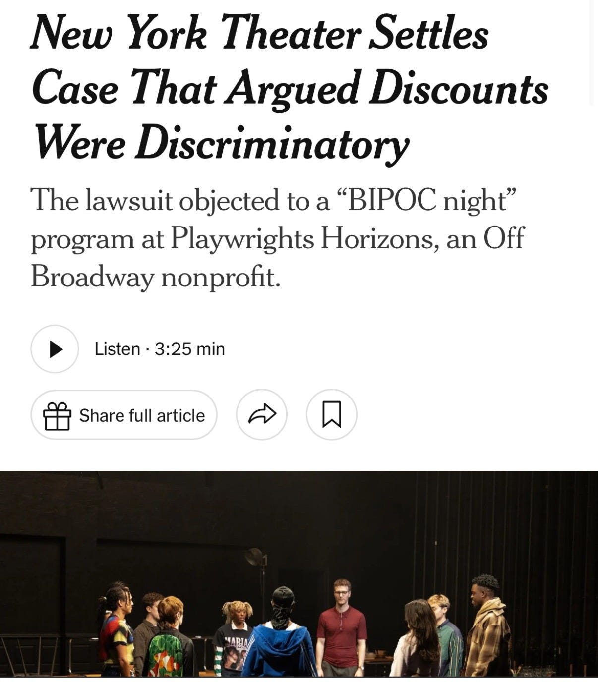 A prominent nonprofit theater in New York has settled a lawsuit claiming that a discount offered to people of color was racially discriminatory. Playwrights Horizons, an Off Broadway company…offered an apology to Kevin Lynch, a white musician from New Jersey who sued over last fall’s “BIPOC night”…[Playwrights Horizons wrote that it] “regrets that Mr. Lynch felt excluded because of his race,” …[and we] have agreed to resolve the matter out of court.” …Lynch, in a statement…said he was pleased with the outcome. "Race-based ticket pricing violates all our civil rights, regardless of which race is on the receiving end of the discrimination…I consider it a victory for civil and human rights.”
