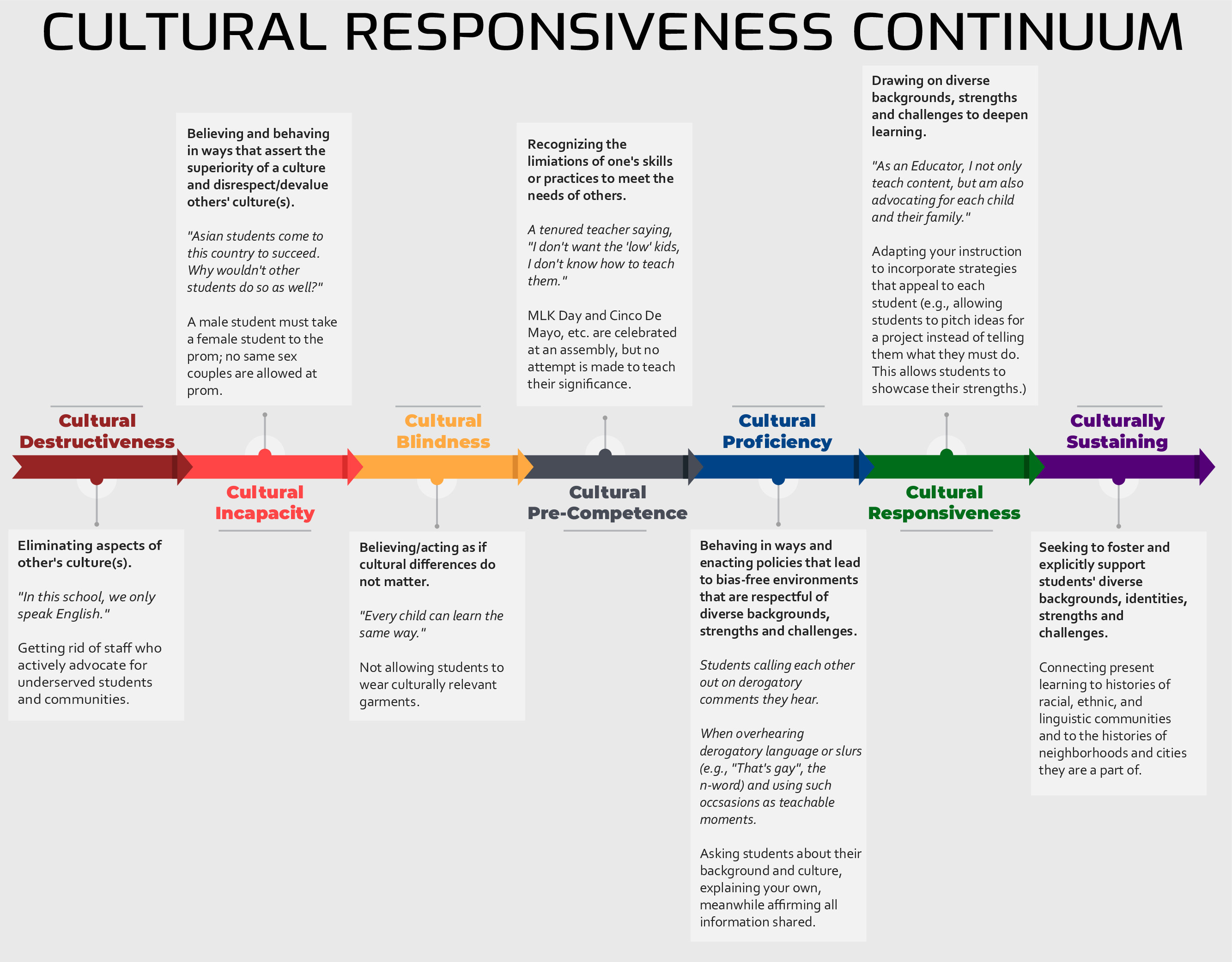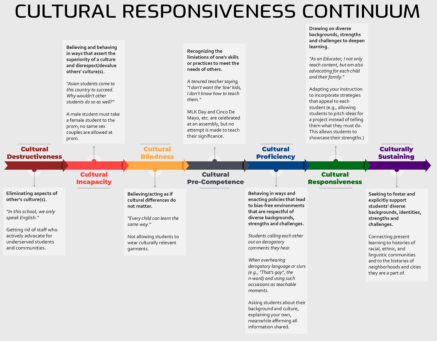The DESE website provides educators with a graphic depicting the “Cultural Responsiveness Continuum.” It contains seven stages ranging from “Cultural Destructiveness,” which is defined by “eliminating aspects of other’s culture(s),” to “Culturally Sustaining,” defined by a school “seeking to foster and explicitly support students’ diverse backgrounds, identities, strengths, and challenges.”