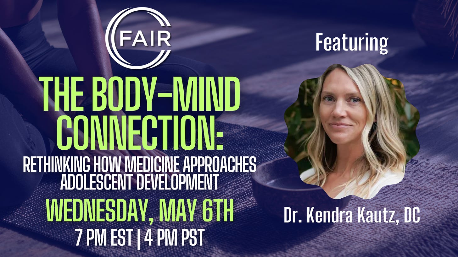 Mood swings, difficulty focusing, disrupted sleep, irregular periods are all hallmarks of adolescence and not necessarily signs of disorder. Yet antidepressant prescriptions for teens have risen 66% in six years, ADHD diagnoses now affect more than 6 million children, and hormonal contraception is routinely prescribed to teenage girls for symptoms that may reflect normal development. Join FAIR and Dr. Kendra Kautz, DC for a candid conversation about what parents are often not told before a prescription is written and what questions they have every right to ask. Drawing on real cases and peer-reviewed research, this webinar will explore the physiological context behind adolescent symptoms and ask what informed consent should really mean before a family agrees to a prescription that could change a developing brain.