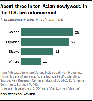 For U.S.-born Americans with Asian or Latin American ancestry, today the rate of marriage to a person with a different “race” or ethnicity is even higher—46% and 39% respectively.