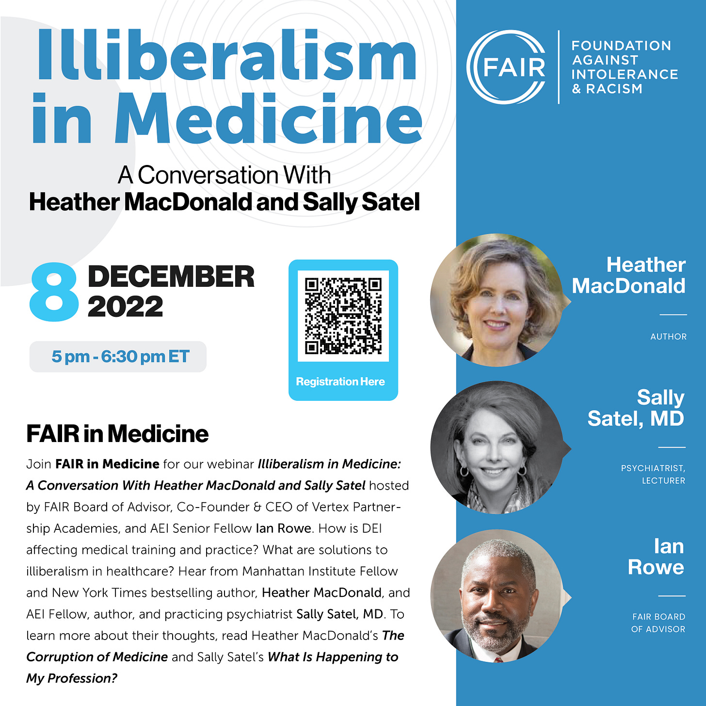 Join FAIR in Medicine on December 8, 2022 for our webinar Illiberalism in Medicine: A Conversation With Heather MacDonald and Sally Satel hosted by FAIR Board of Advisor, Co-Founder & CEO of Vertex Partnership Academies, and AEI Senior Fellow Ian Rowe. How is DEI affecting medical training and practice? What are solutions to illiberalism in healthcare? Hear from Manhattan Institute Fellow and New York Times bestselling author, Heather MacDonald, and AEI Fellow, author, and practicing psychiatrist Sally Satel, MD. To learn more about their thoughts, read Heather MacDonald’s The Corruption of Medicine and Sally Satel’s What Is Happening to My Profession?