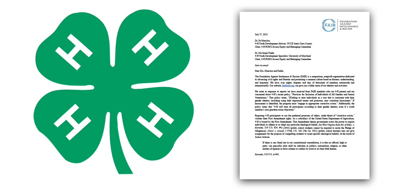 On July 27th, FAIR’s legal team sent a letter to Dr. Fe Moncloa, Youth Development Advisor at UCCE Santa Clara County in California, and Dr. Nia Imani Fields, Youth Development Specialist at the University of Maryland, regarding a policy implemented by 4-H, a subdivision of the United States Department of Agriculture and the Nation's largest youth development organization.