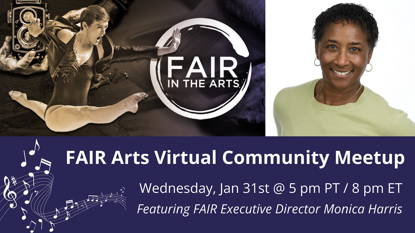 Join FAIR in the Arts TODAY, January 31st @ 5 pm PT / 8 pm ET for a virtual Community Meetup to ring in the new year! Featuring FAIR Executive Director Monica Harris, we will speak with Monica about her career in entertainment, how she sees the arts playing a pivotal role in FAIR's mission, and FAIR in the Arts' goals for 2024. Come to connect with like-minded artists and participate in a community discussion around the future of the arts & culture.