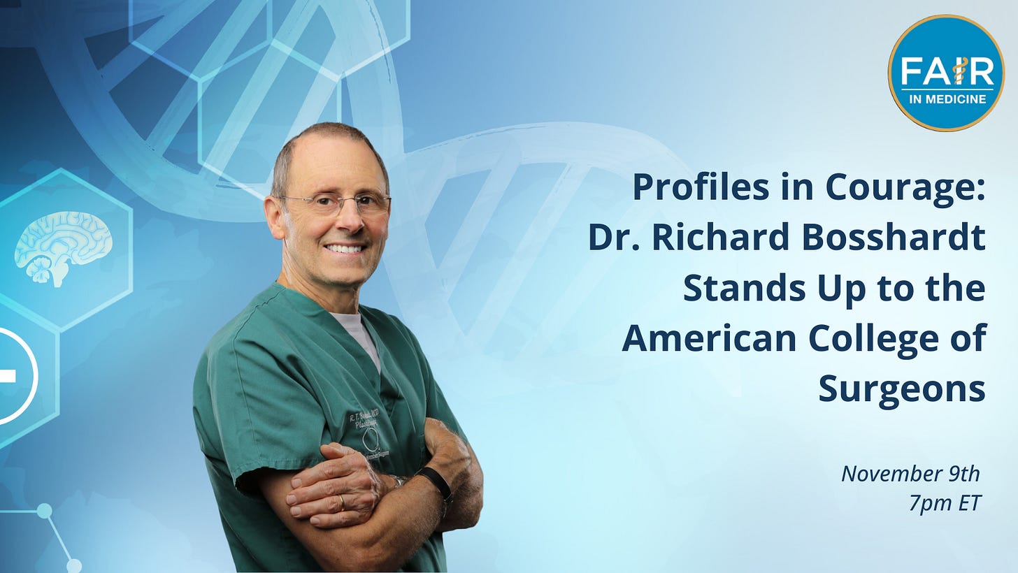 Join FAIR in Medicine and FAIR’s Executive Director, Monica Harris on November 9th at 7pm ET for a conversation with Dr. Richard Bosshardt, a plastic surgeon and FAIR in Medicine and DoNoHarm Fellow, who is standing up for viewpoint diversity in the American College of Surgeons. When he was silenced in an online platform for discussing a nuanced approach to healthcare disparities rather than adhering to a race essentialist explanation, Dr. Bosshardt pushed back through various advocacy channels, including legal help from FAIR. Join us to learn from his experience.