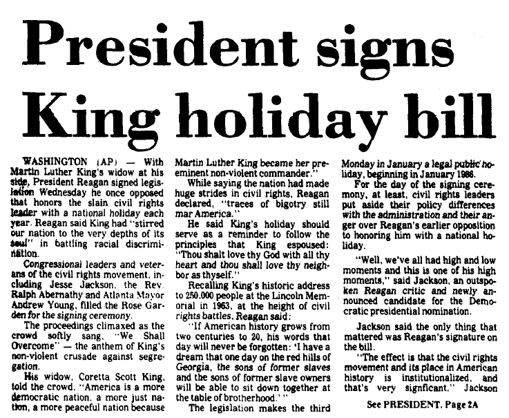 Forty years ago today, President Ronald Reagan signed the King Holiday Bill into law, designating the third Monday in January a federal holiday in honor of Civil Rights leader Dr. Martin Luther King Jr.