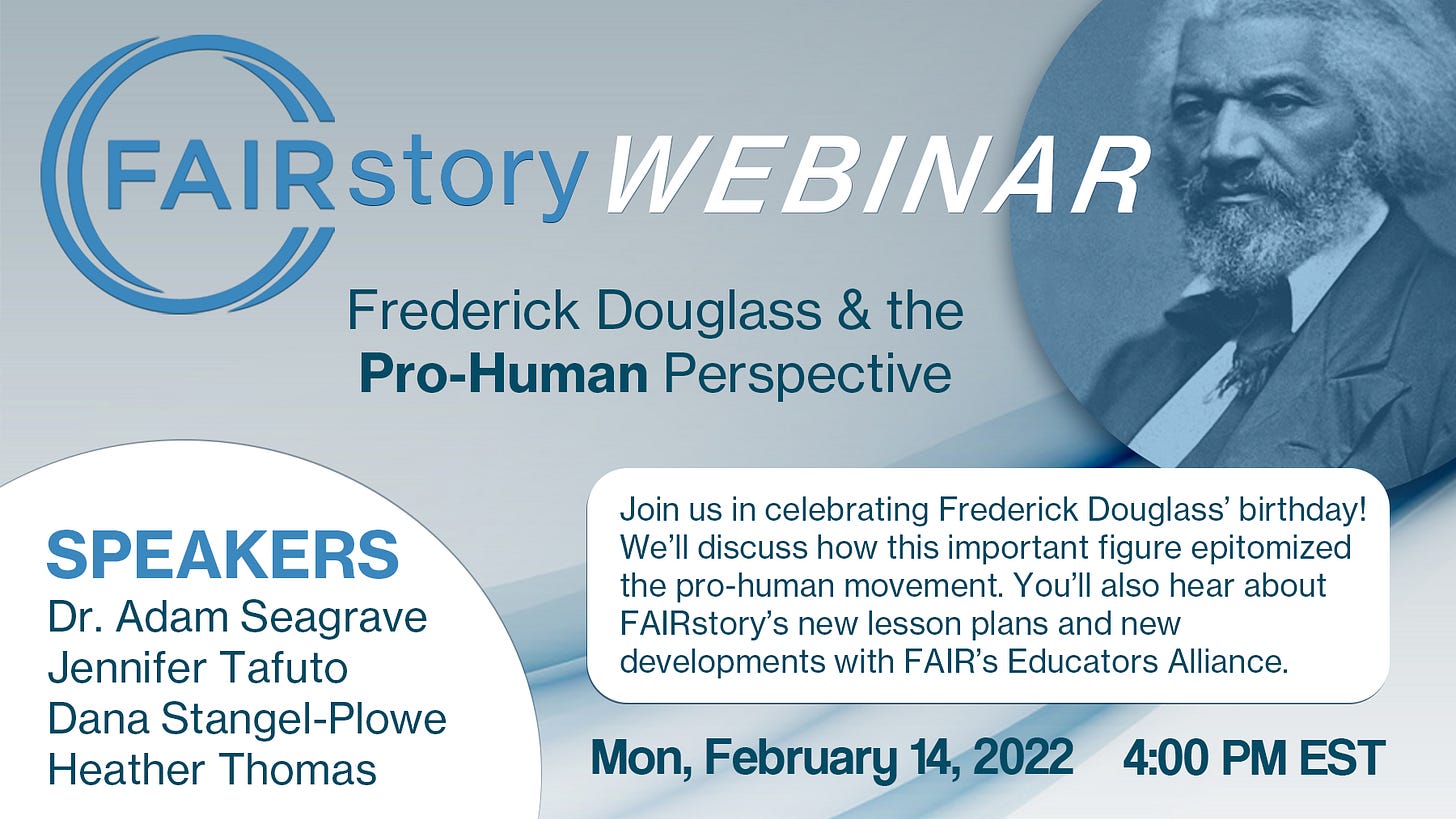 Join us in celebrating Frederick Douglass’ birthday! We’ll discuss how this important figure epitomized the pro-human movement. You’ll also hear about FAIRstory’s new lesson plans and new developments with FAIR’s Educators Alliance. Dr. Adam Seagrave, Jennifer Tafuto, Dana Stangel-Plowe, and Heather Thomas will be your co-hosts.