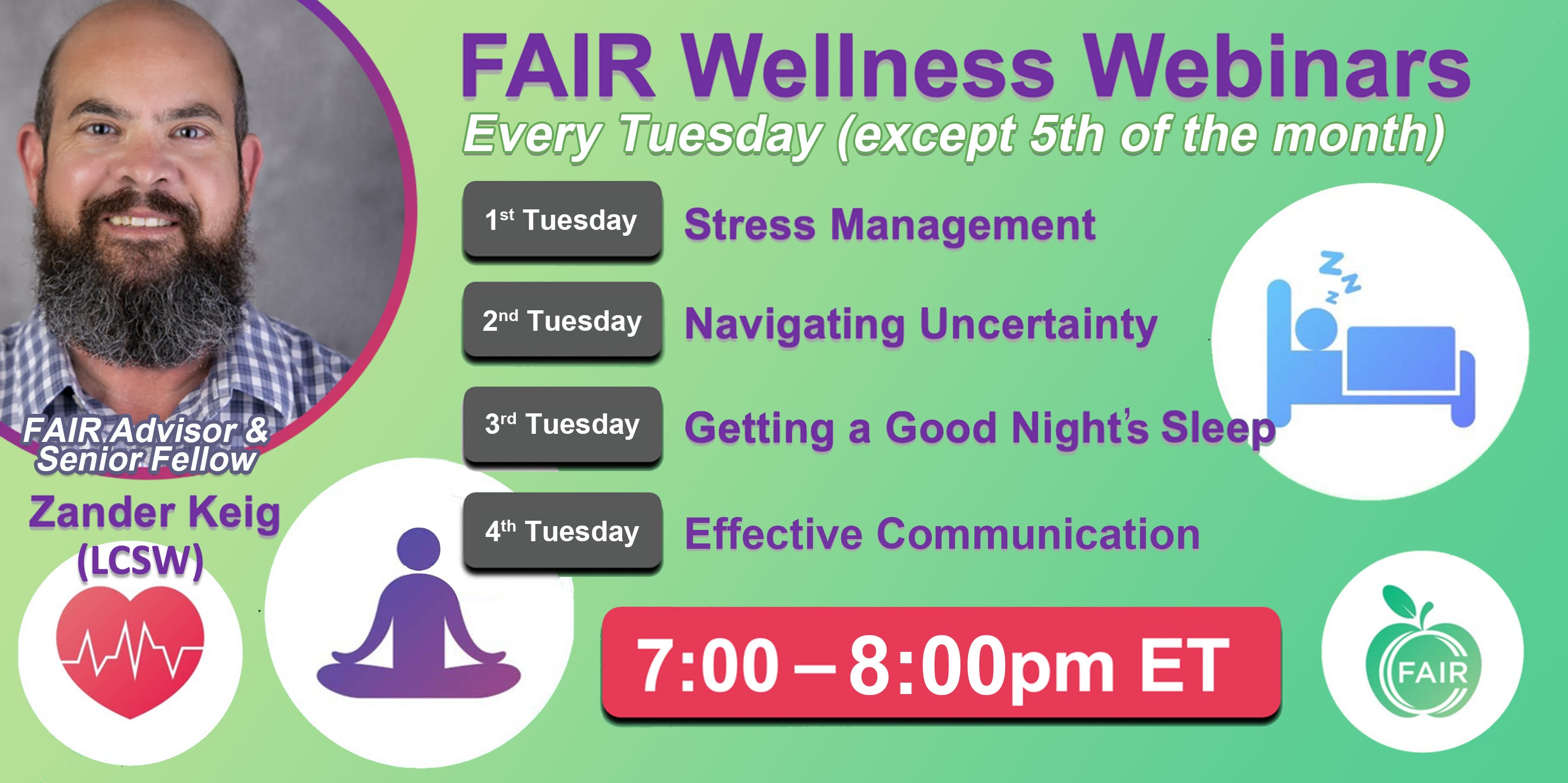 Every Tuesday (except the 5th of the month) from 7:00 to 8:00PM ET, beginning March 1st, FAIR Advisor Zander Keig will be hosting a series of FREE Wellness Webinars for FAIR members. The webinars include: