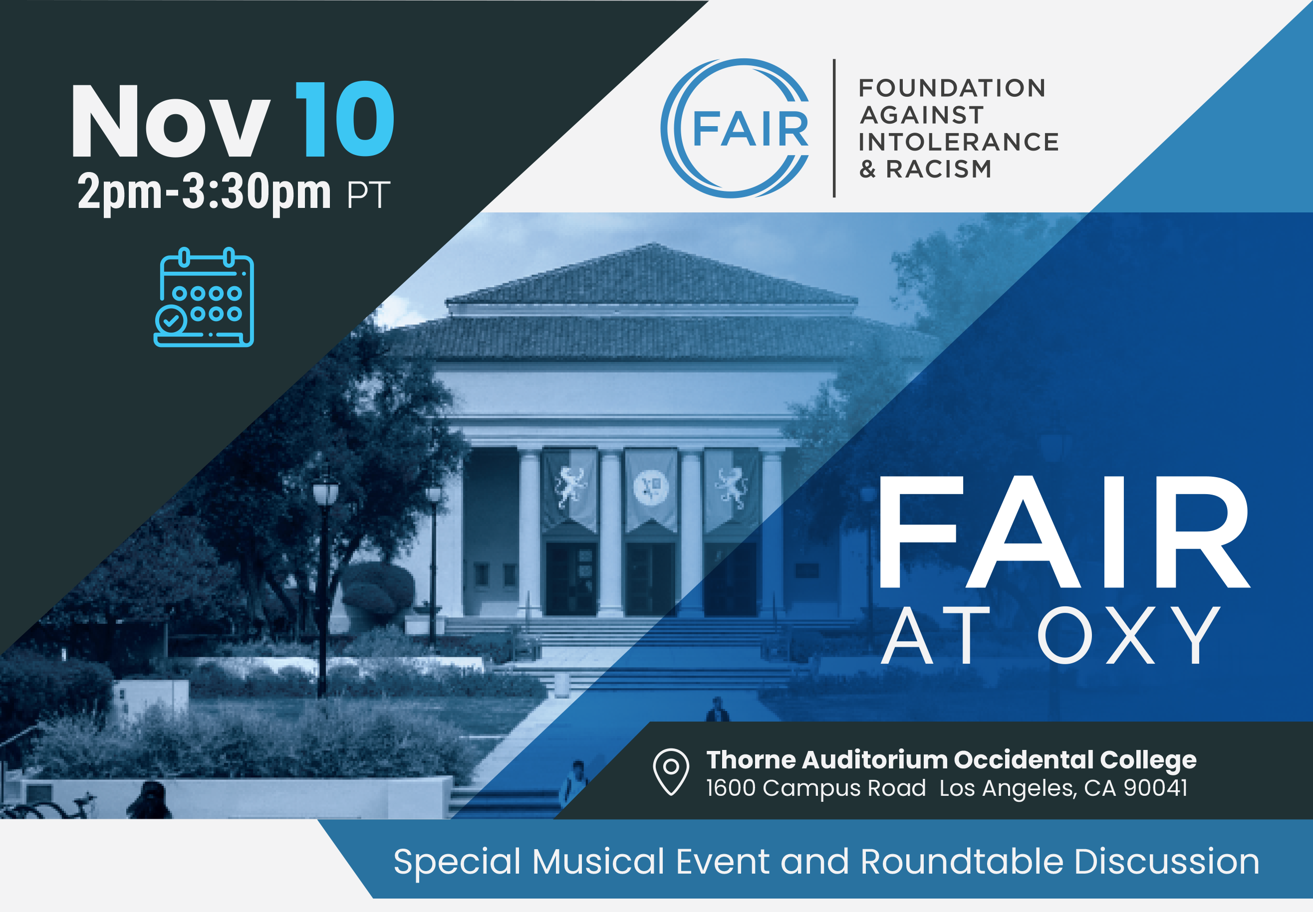 Join FAIR and the Oxy Persuasion Club on Thursday, November 10th at 2:00 p.m. at the Thorne Auditorium at Occidental College for a FREE roundtable discussion and musical event! Emceed by Professor Jacob Mackey and featuring FAIR Founder Bion Bartning, FAIR Advisors Daryl Davis, John Wood, Jr., and Kimi Katiti, and FAIR in the Arts Fellow Winston Marshall, along with Bertrand Cooper and Salomé Sibonex, this will be an afternoon of music and discussion you won’t want to miss!