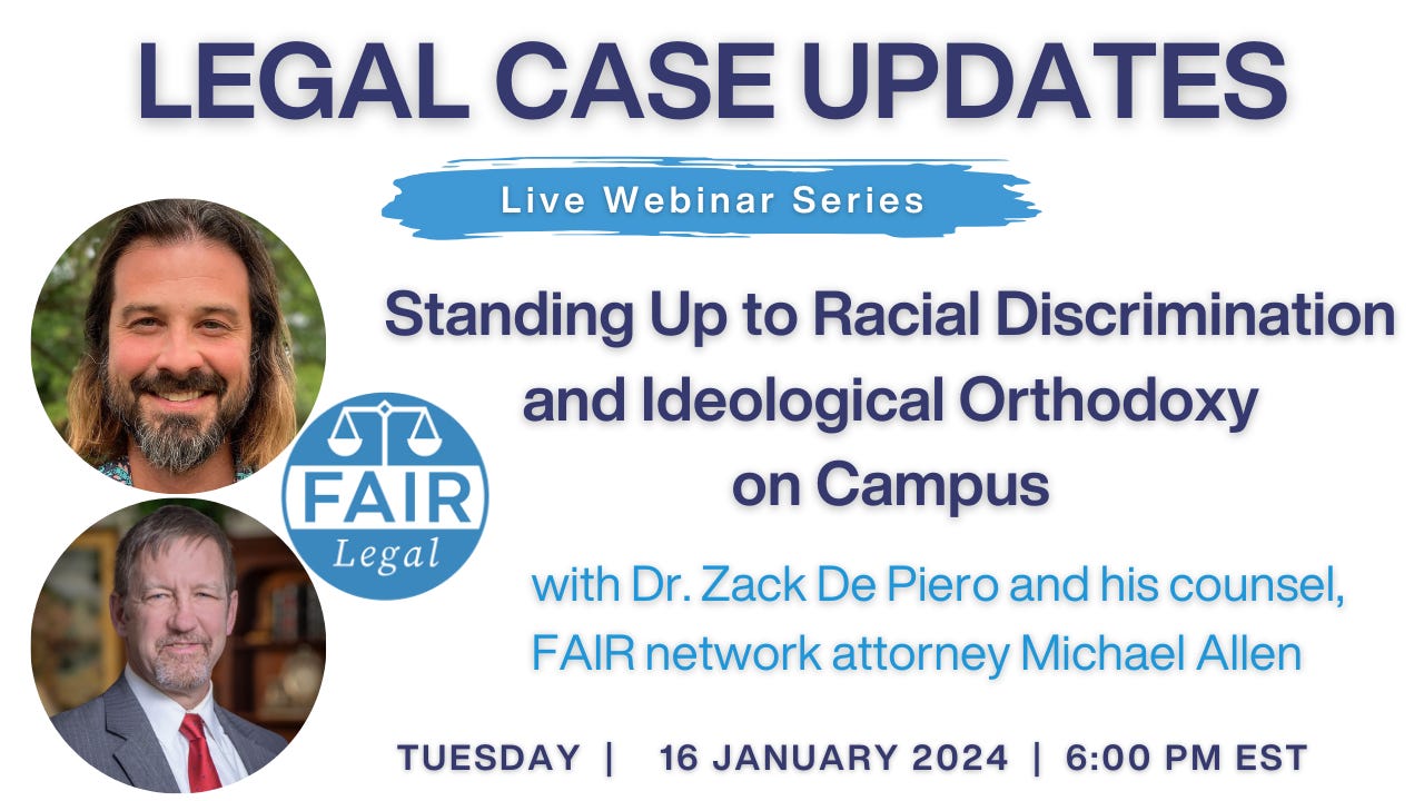 Join FAIR Legal on Tuesday January 16th at 6pm EST for this next installment of our Legal Case Updates webinar series, where we bring you updates on the legal cases that FAIR is supporting! For this upcoming webinar, we are thrilled to be joined by Dr. Zack De Piero, former professor at Penn State University, and his counsel, FAIR network attorney Michael Allen.