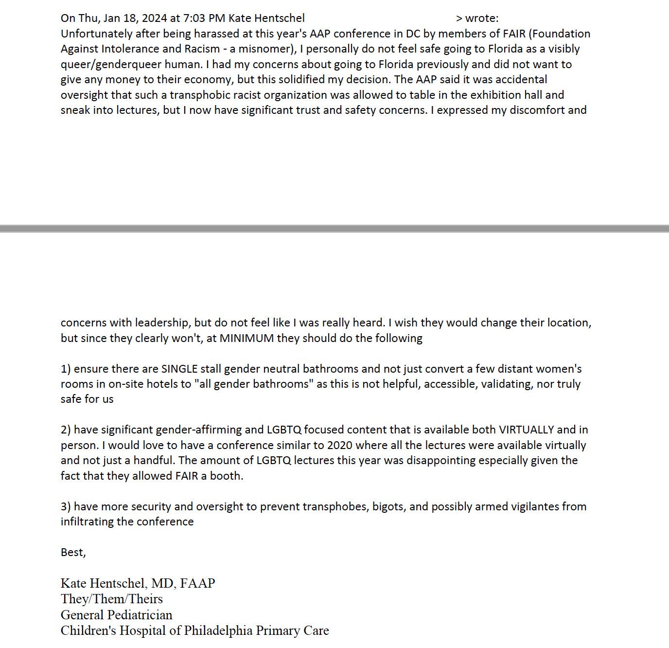 Investigative journalist Benjamin Ryan obtained AAP internal emails and published them in The New York Sun and his Substack. In one of the emails, a pediatrician member claimed to have been harassed by FAIR In Medicine at the 2023 convention and wrote, “The AAP said it was accidental oversight that such a transphobic, racist organization was allowed to table in the exhibition hall and sneak into lectures.” Of note is the fact that I didn’t join FAIR until months after that conference.