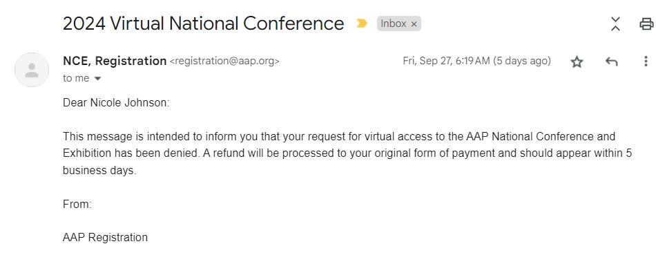 FAIR in Medicine Director Nikki Johnson describes her recent experience having her access revoked to the American Academy of Pediatrics national conference