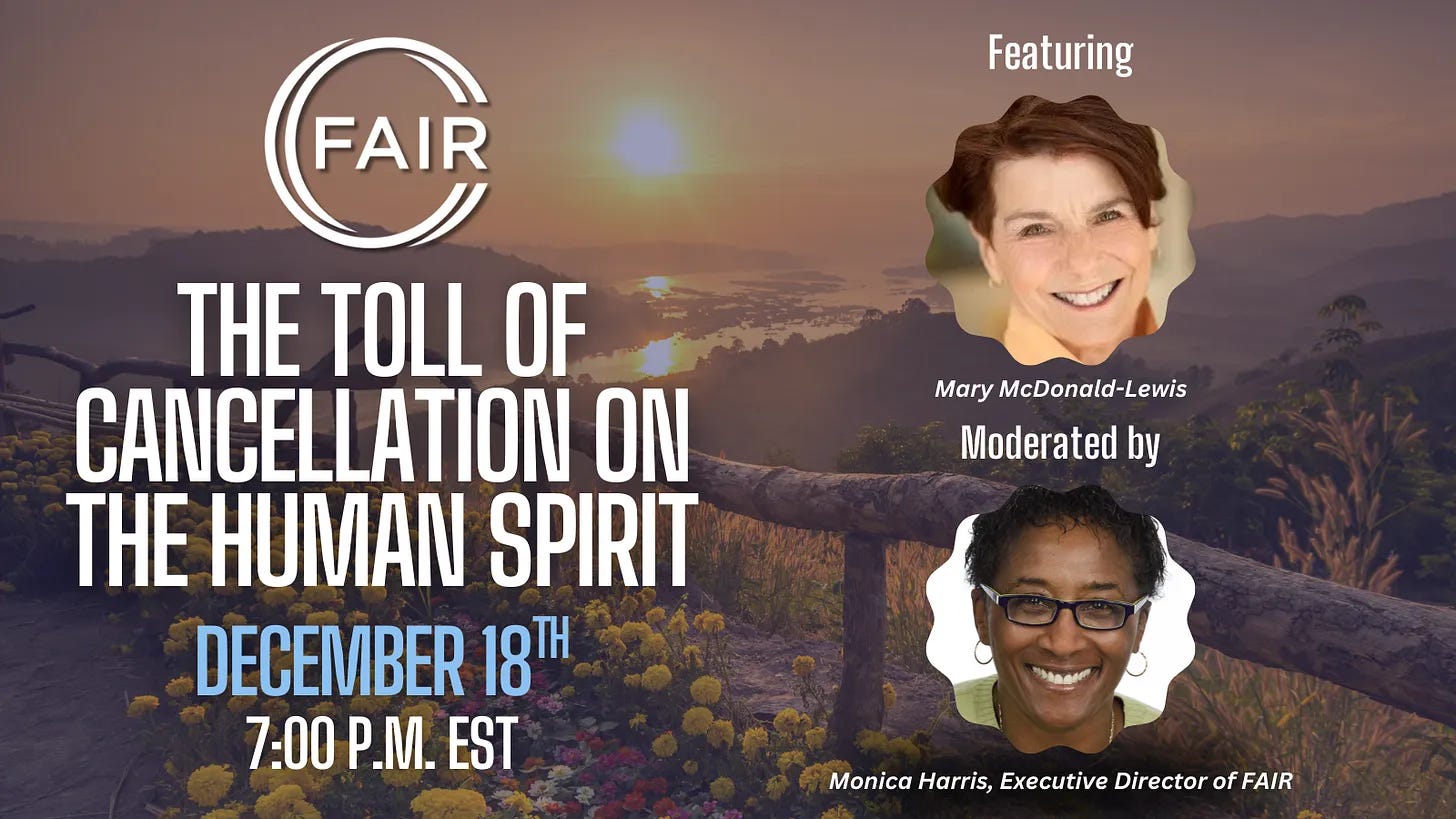Please join us for an in depth discussion between FAIR Executive Director and FAIR in the Arts member Mary McDonald-Lewis! We will explore the human cost of cancellation, the spiritual and emotional dimensions that often go unseen, and the importance of building a culture where disagreement does not mean disposability. Our guest will share her story, her losses, her resilience, and her hope for a better future—one marked not by fear, but by exchange, openness, and shared humanity.