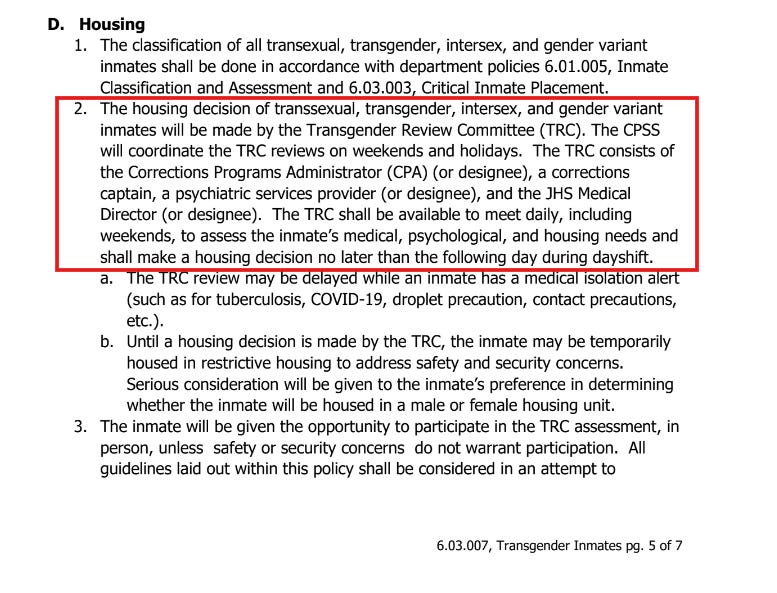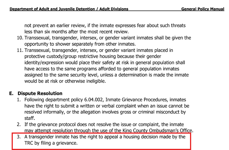 Olivia: Inmates declaring transgender status would meet with the Transgender Review Committee (TRC) within 24 hours. On paper, this was an interdisciplinary meeting between a medical professional, a mental health professional, and representatives from the King County Department of Adult and Juvenile Detention (DAJD). The health staff would determine if the inmate needed medical or psych housing, but whether that placement was in male or female housing was entirely up to DAJD.