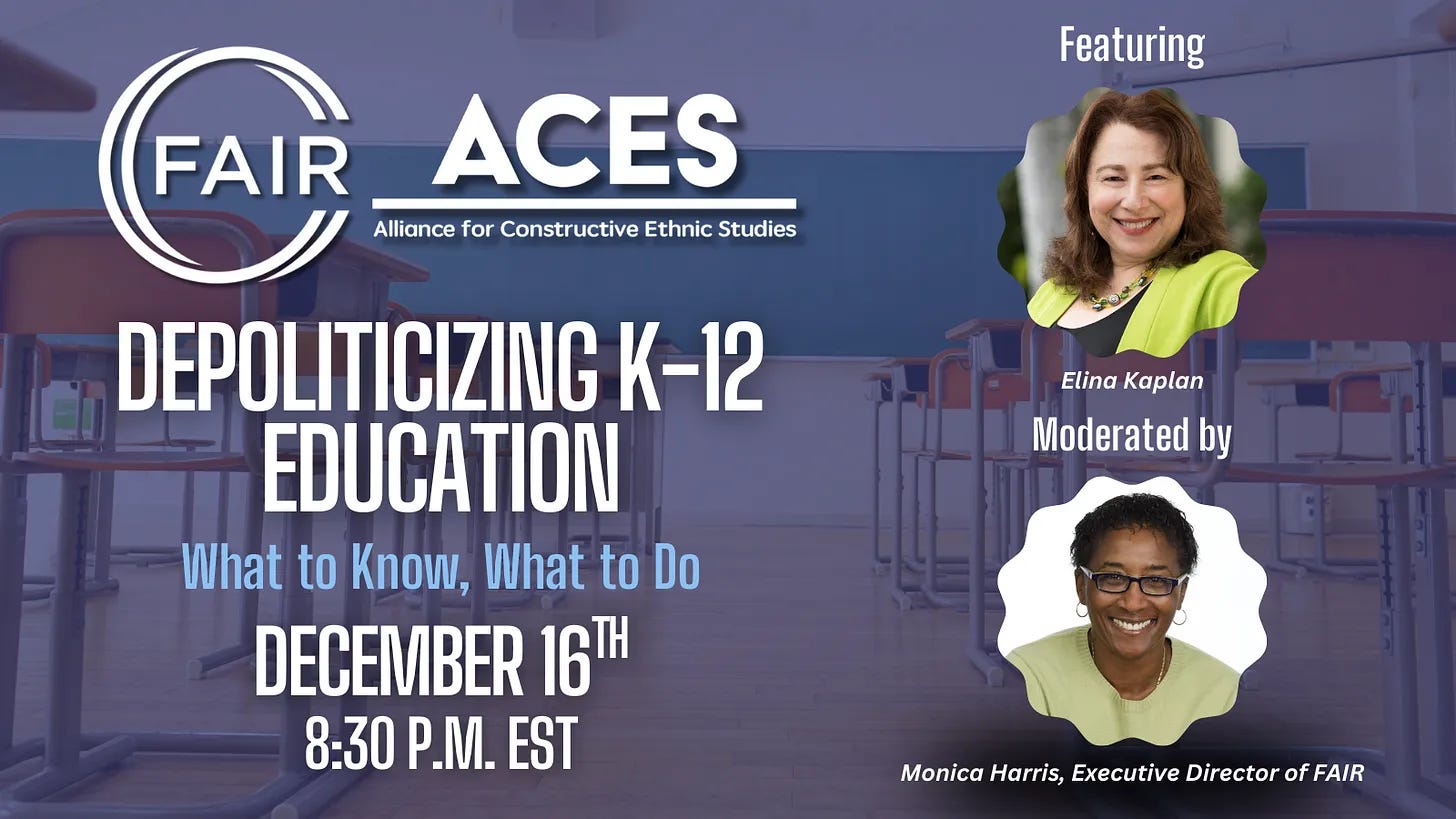 K-12 schools nationwide are increasingly becoming infused with political agendas. Learn what politicization looks like throughout curricula, including in subjects such as Ethnic Studies. On December 16th at 8:30pm EST, join us to find out how ACES and FAIR are working to protect students and promote constructive, quality education, and what YOU can do in your own communities.