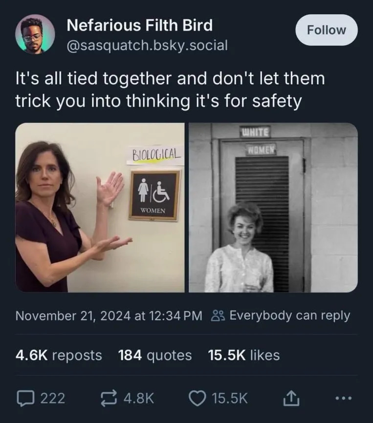 As philosophy professor Holly Lawford-Smith explains in Gender-Critical Feminism: “From a gender-critical perspective, there is no automatic right to inclusion, because these spaces are part of a package of political provisions designed to improve women’s participation in public life.” We created women’s-only spaces for women, to advance their interests, to rectify discrimination, to protect their needs. In fact, it took decades for female representatives to get a bathroom of their own anywhere near the House floor. We may need to create spaces for males who transition, for their interests and needs, too—but they do not automatically earn entry into women’s spaces by way of proclamation, identity, or even physical alterations to themselves.